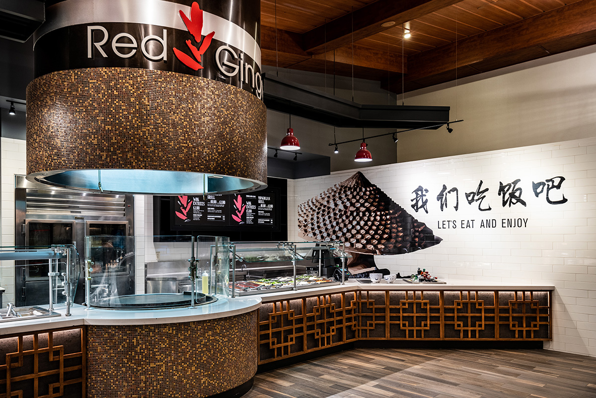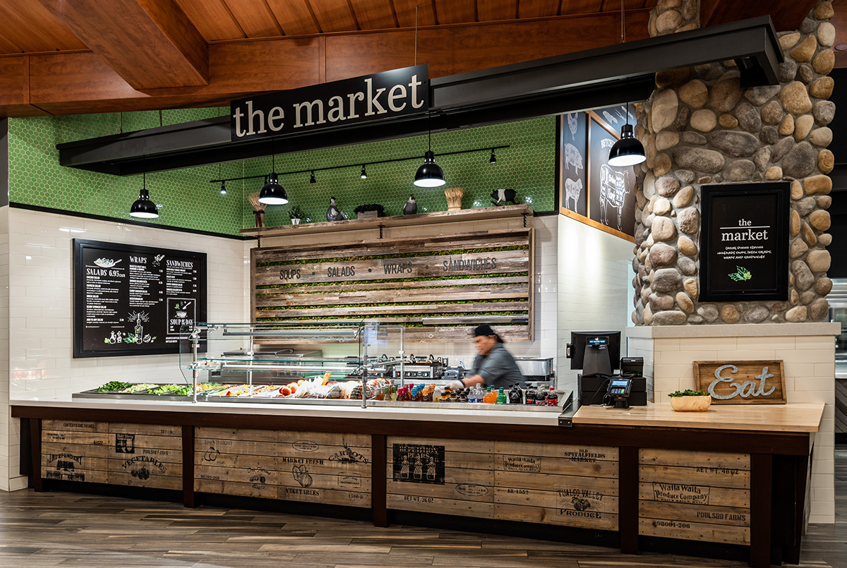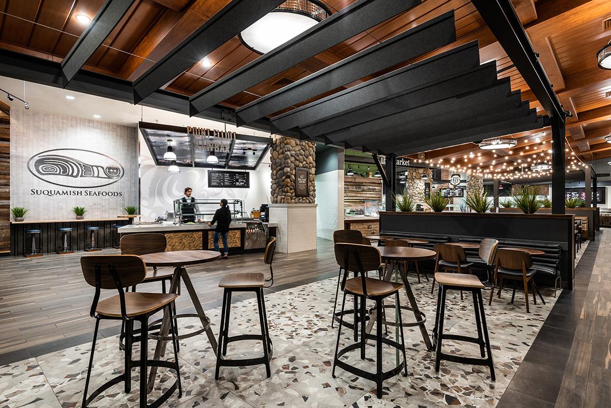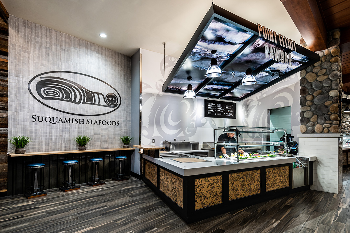 Designs for each dining choice are inspired by the menus of the venues and are completely unique. Visitors enter the Salish Kitchen and within their sightline are all six distinctive options unified with a dining room that allows guests to make their individual food choices and come back to commune over their meal together.